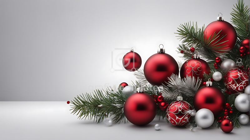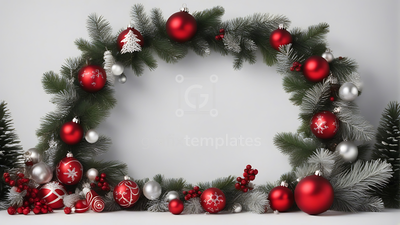 This premium holiday image presents a beautifully composed Christmas backdrop designed specifically for horizontal layouts and wide banners. The scene features a decorative frame—styled as either a structural arch or a natural pine wreath—adorned with a lavish arrangement of holiday textures. Details include frosted fir needles, vibrant red and silver glass baubles, satin ribbons, and charming figures such as metallic reindeer or winter stags standing on a bed of soft snow. The composition prioritizes usability, offering a clean, open central area (copy space) ideal for placing text, logos, or product mockups. Whether set against a crisp white studio background or a rich festive red, the professional lighting highlights the glossy reflections of the ornaments and the texture of the greenery. This versatile image is an essential asset for digital marketers and designers creating seasonal website hero sections, social media cover posts, and printed holiday invitations. All images are AI-generated for creative purposes only, with no basis in reality. Any resemblance to real individuals or events is coincidental. Viewer discretion is advised.