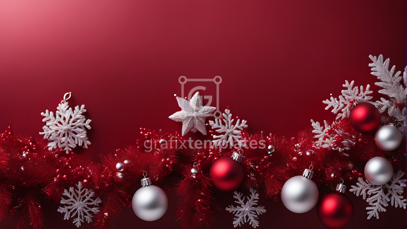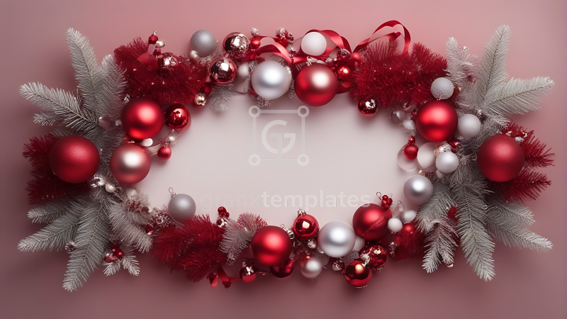 This premium holiday image presents a beautifully composed Christmas backdrop designed specifically for horizontal layouts and wide banners. The scene features a decorative frame—styled as either a structural arch or a natural pine wreath—adorned with a lavish arrangement of holiday textures. Details include frosted fir needles, vibrant red and silver glass baubles, satin ribbons, and charming figures such as metallic reindeer or winter stags standing on a bed of soft snow. The composition prioritizes usability, offering a clean, open central area (copy space) ideal for placing text, logos, or product mockups. Whether set against a crisp white studio background or a rich festive red, the professional lighting highlights the glossy reflections of the ornaments and the texture of the greenery. This versatile image is an essential asset for digital marketers and designers creating seasonal website hero sections, social media cover posts, and printed holiday invitations. All images are AI-generated for creative purposes only, with no basis in reality. Any resemblance to real individuals or events is coincidental. Viewer discretion is advised.