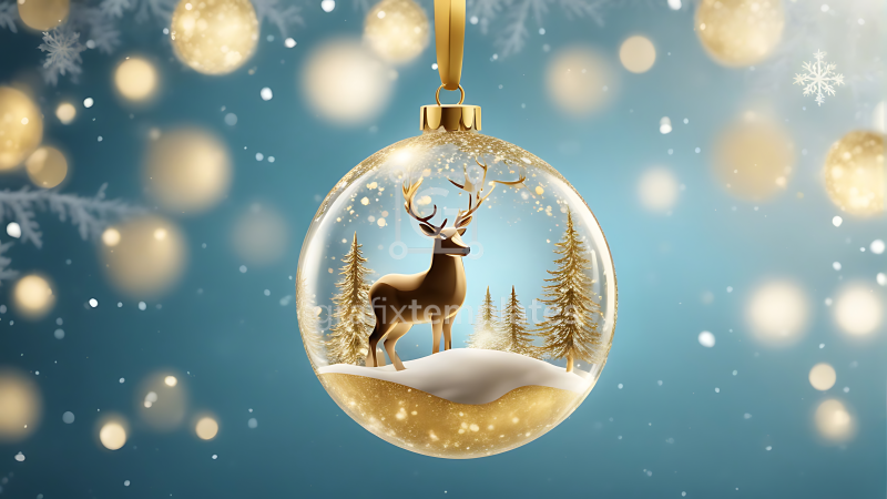 A magical 3D rendered Christmas glass ball ornament containing a miniature golden winter scene. These crystal-clear baubles feature exquisite interior details like golden deer, frosted pine trees, and tiny villages resting on a bed of white snow. Set against a dreamy background of glowing bokeh lights and falling snowflakes, these illustrations embody the elegance and wonder of the holiday season, making them perfect for luxury greeting cards and festive wallpapers.