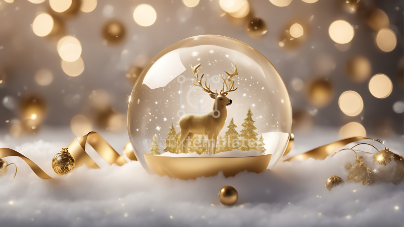 This mesmerizing 3D illustration showcases a pristine glass Christmas ornament acting as a window into a magical winter wonderland. Inside the transparent sphere, a miniature scene is crafted from gold and snow, featuring majestic reindeer, sparkling fir trees, or quaint holiday cottages. The intricate golden textures contrast beautifully with the pure white snow base, creating a sense of luxury and serenity. The background complements the centerpiece with a soft, defocused display of festive bokeh lights in warm gold or cool blue tones. Whether hanging from a pine branch or resting on a wooden podium, the composition radiates a cozy yet sophisticated holiday atmosphere. This high-resolution image is an ideal visual asset for premium holiday marketing, seasonal website headers, and digital storytelling that requires a touch of fantasy and elegance. All images are AI-generated for creative purposes only, with no basis in reality. Any resemblance to real individuals or events is coincidental. Viewer discretion is advised.